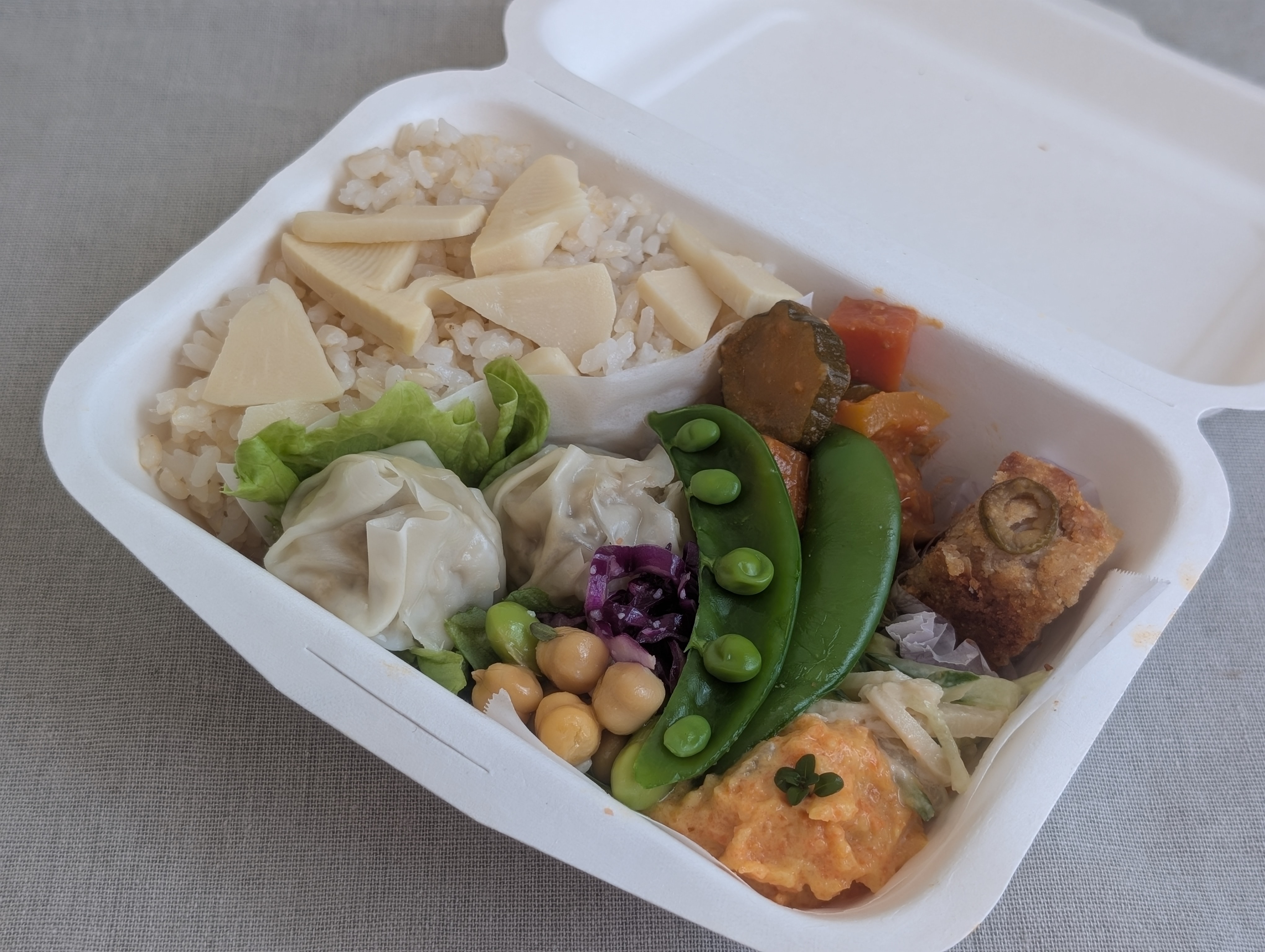 4月は旬の筍や春野菜を使ったフルヴィーガンのお弁当です。発酵調味料を使用した味付けにしています。 ・筍の塩麹ごはん ・味噌ラタトゥイユ ・キャベツと豆腐の焼売 ・にんじんムース ・豆のマリネ ・筍と野菜のごまヴィーガンマヨネーズサラダ ・新玉ねぎ入り酒粕味噌のケークサレ ・紫キャベツコールスロー ・スナップエンドウ ごはんの量:約150g このメニューは、小麦、アーモンド、大豆の含まれる材料を使用しています。 サラダ等の野菜は仕入れにより写真とは異なる場合があります。 ※ゴミ減量のため、エコバック、マイ箸をご用意ください。必要な場合は別途お買い上げいただきます。外部サイト(STORES)にて予約時にカートに追加してご一緒にご購入ください。